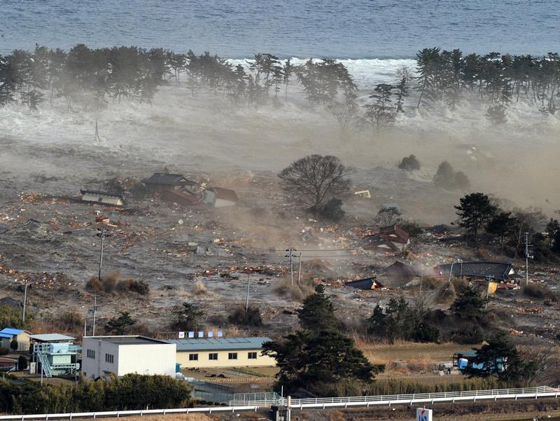Cars, trucks, boats, and buildings are swept away by the force of tsunami waters caused by a powerful earthquake in japan.